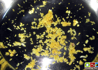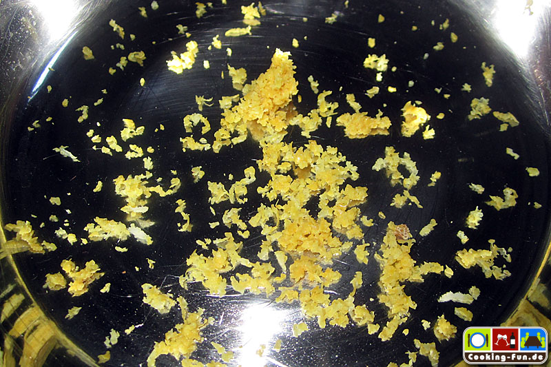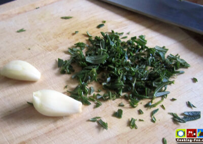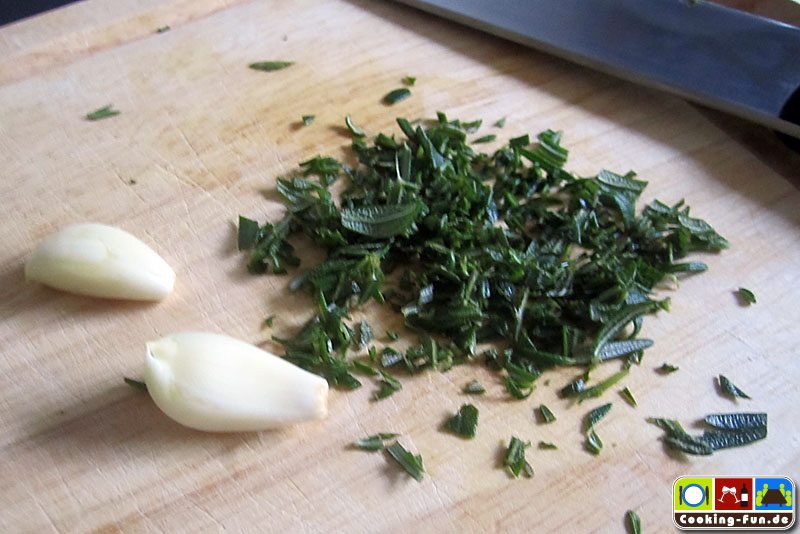 Entweder frische Kräuter hacken (Estragon, Petersilie, Thymian, Rosmarin etc.) oder einfach eine TK-8-Kräuter-Mischung verwenden. Schalotten und Knoblauch feinst würfeln. Zitronenschale abreiben und Zitrone für den späteren Gebrauch auspressen.