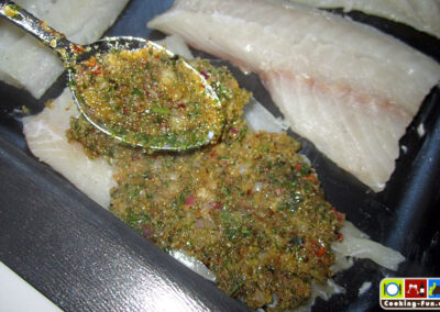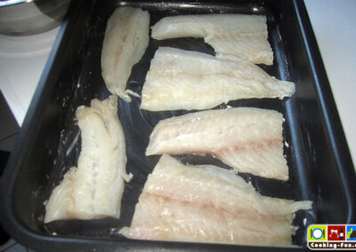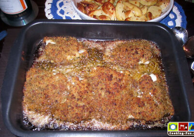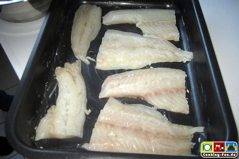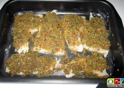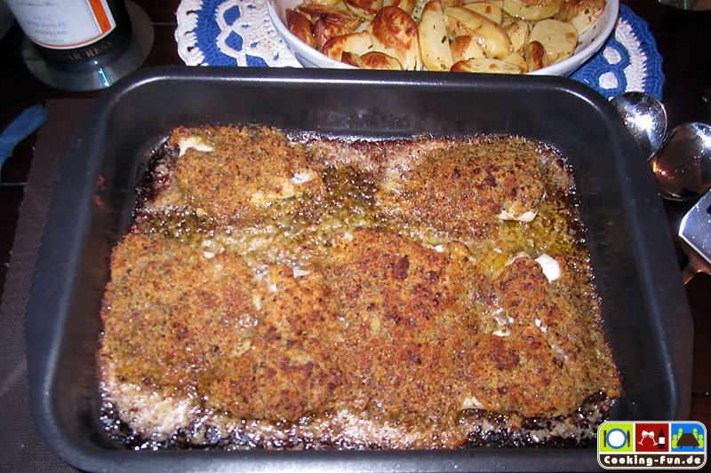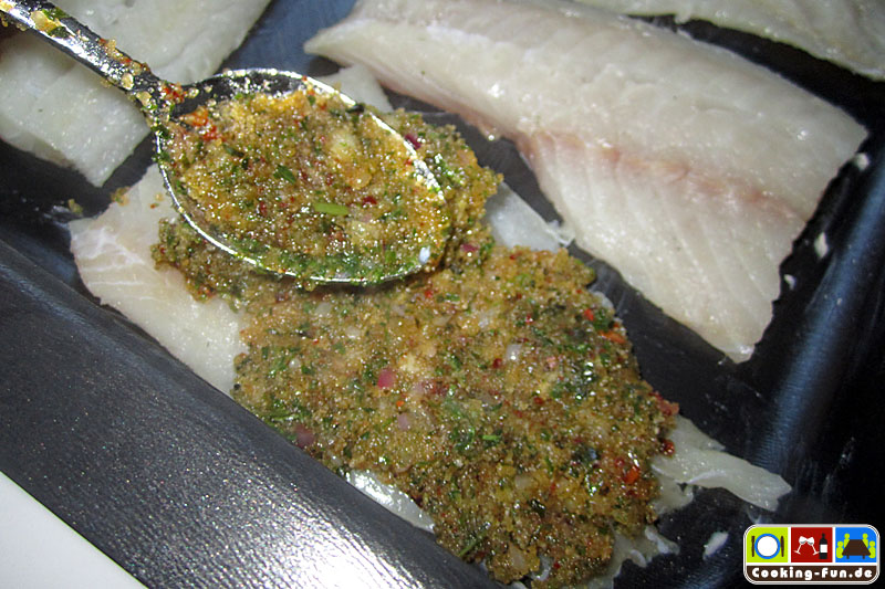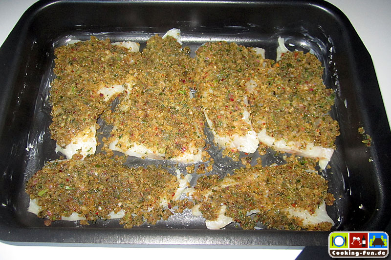 Die Fischfilets ggf. von letzten Gräten befreien, säubern, salzen und mit etwas Zitronensaft säuern und in eine eingefettete Auflaufform legen. Die Streuselkruste gleichmäßig auf den Fischstücken verteilen. Bevor nun alles für ca. 15 Minuten in den vorgeheizten Ofen kommt, gieße ich noch etwas Weißwein an die Fischfilets, so dass die Zwischenräume ca. 1-2mm hoch benetzt sind. Je nach Belieben kann man zum Ende der Backzeit noch den Grill zuschalten, um die Kruste richtig goldbraun knusprig zu bekommen.