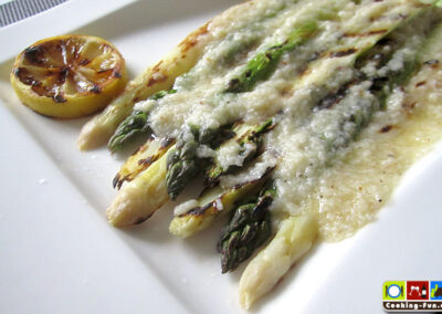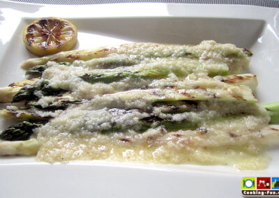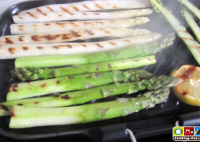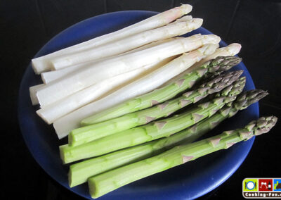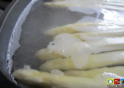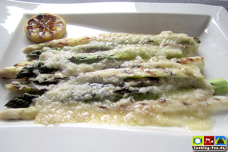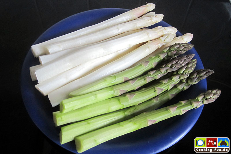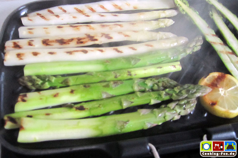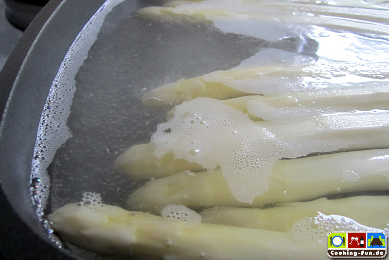 Bei besonders dicken Spargelstangen etwas länger vorgaren, damit man den Spargel nicht schwarz braten muss.