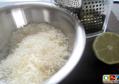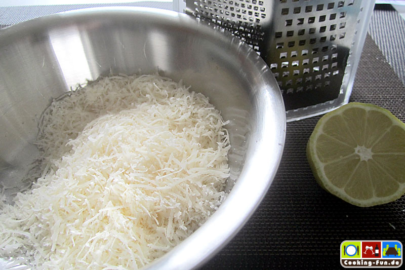 Den Parmesan frisch fein reiben und mit dem Saft einer halben Zitrone sowie 6-7EL Olivenöl vermischen. Mit Salz (Vorsicht, der Parmesan bringt eine salzige Note mit sich), einem TL Zucker sowie Pfeffer würzen.