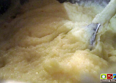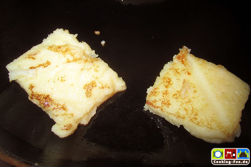 Während die Kirschen in den Topf kommen, kann gleichzeitig eine Pfanne angeheizt werden (mit einer Grillpfanne gibt’s noch das typische Muster, kommt aber auch auf die Konsistenz der Grießmasse an). Die Grießplatte in Quadrate oder Rauten schneiden (oder Formen ausstechen) und kurz scharf anbraten, so dass die Teile etwas Farbe bekommen.