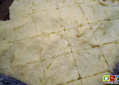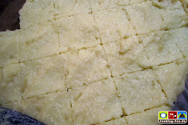 In einem Topf die Milch erhitzen, dabei den Zucker darin auflösen. Wenn die Milch kocht, den Grieß einstreuen und ordentlich rühren. Noch etwa 5 Minuten bei kleiner Hitze köcheln lassen, dann vom Herd nehmen und etwas abkühlen lassen. Das Ei in einer Schüssel verquirlen und unter die Grießmasse rühren. Kurz ziehen lassen und auf Backpapier ausbreiten, etwa 2-3 cm hoch, dann mindestens eine Stunde abkühlen und erhärten lassen.