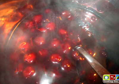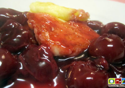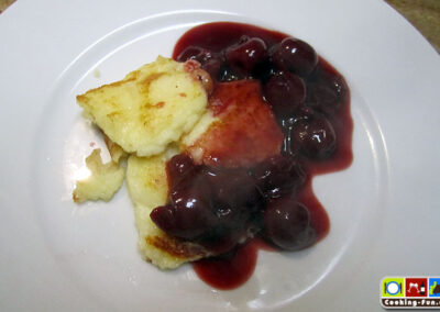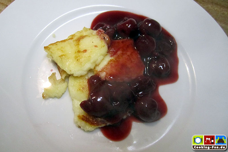Grießecken mit den Kirschen anrichten.