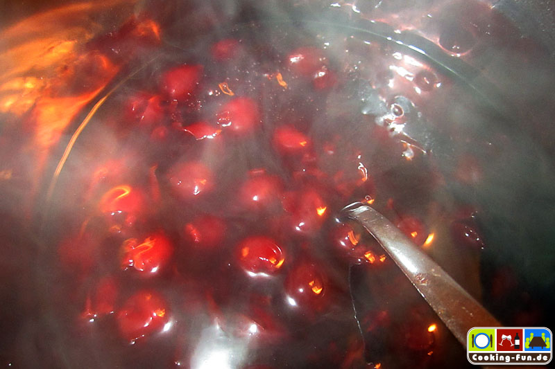 Von den Kirschen den Saft abgießen und auffangen. Etwa ein Drittel des Saftes mit Zucker (bei süßeren Kirschen oder Schattenmorellen entsprechend weniger), Zimt und Stärke ordentlich verquirlen, den Rest mit den Kirschen zum Kochen bringen, Stärkemischung eingießen und erneut aufkochen, dabei mit Balsamico-Essig abschmecken (die Menge hängt vom verwendeten Essig ab, da hilft nur probieren) die Flüssigkeit sollte jetzt zähflüssig-fester sein. Von der Flamme nehmen.