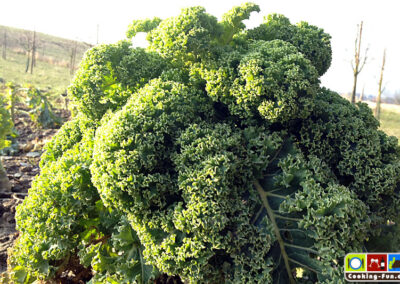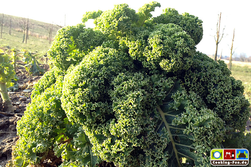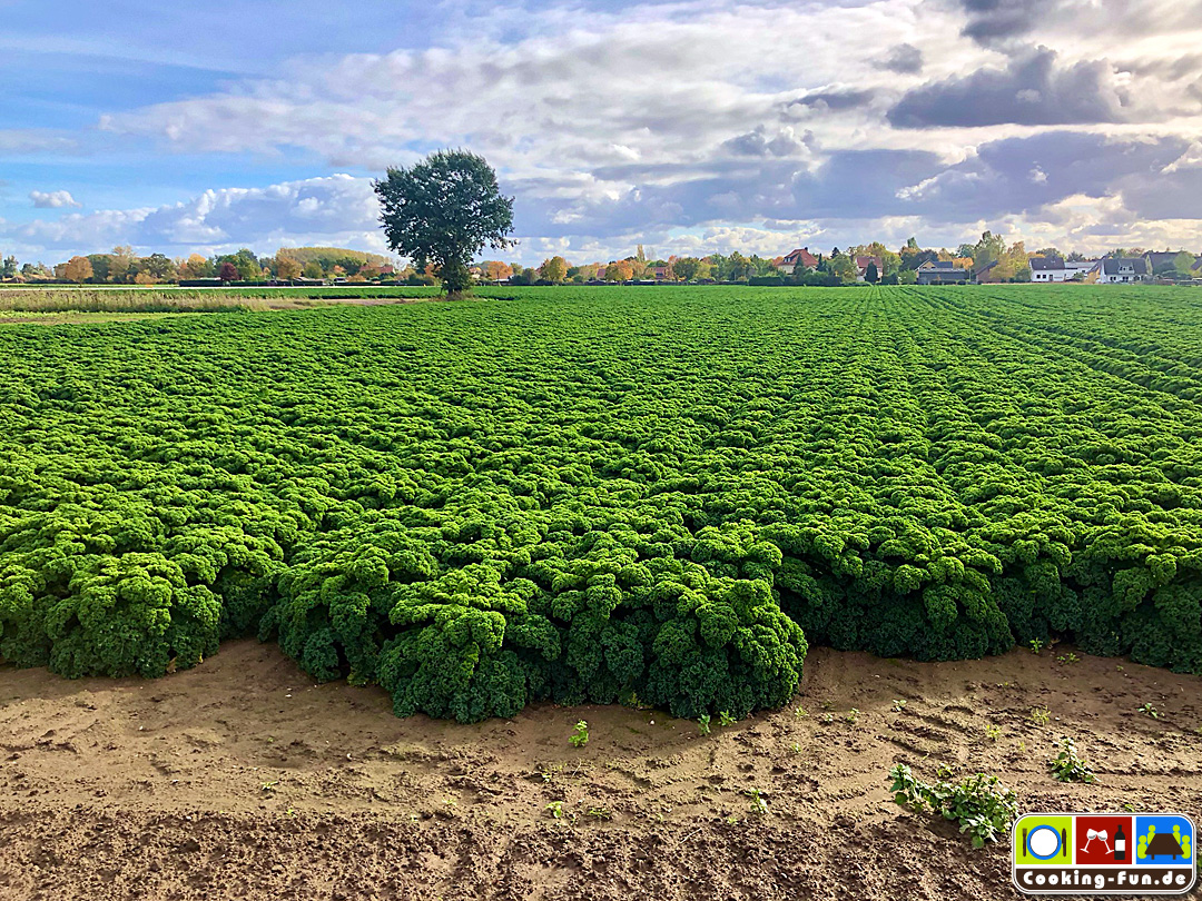 Der März hat begonnen und ich war überrascht, als ich bei einem Spaziergang bei Bonn auf einem Feld noch angepflanzten Grünkohl (regional auch Braunkohl genannt) gesehen hatte. Inspiriert von diesem Bild ging es wenige Tage später auf den Markt. An einem Stand hab ich den wohl letzten frischen Grünkohl der Saison bekommen. Frischer Grünkohl ist am besten, wenn er Frost abbekommen hat (die Kälte lässt den Zuckergehalt steigen, was den leicht süßlichen Geschmack erklärt – bei modernen Züchtungen spielt das allerdings keine Rolle mehr), also von Dezember bis Anfang März.