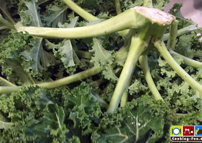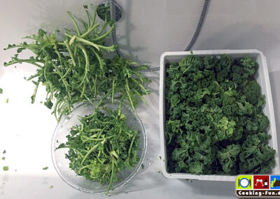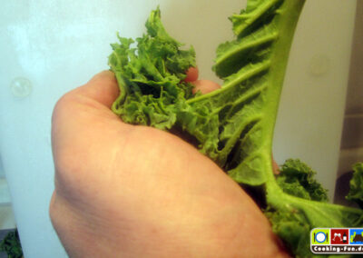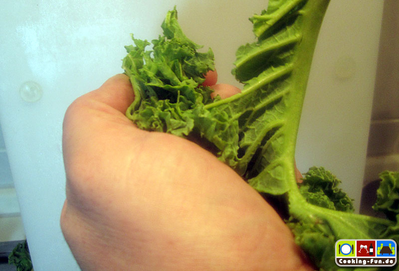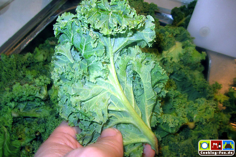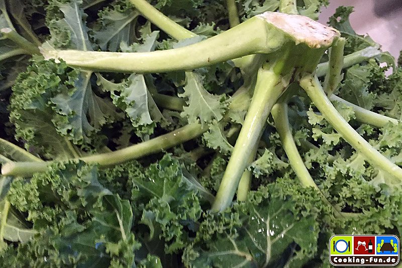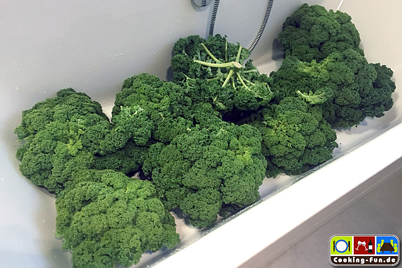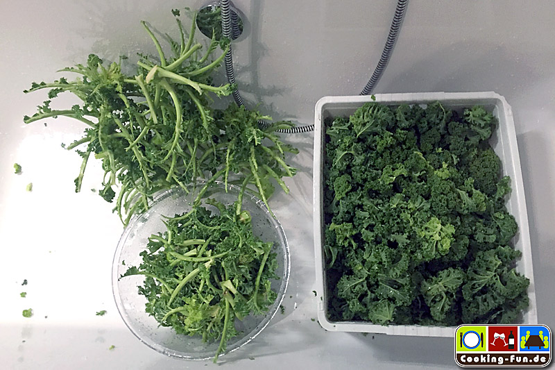 Die gemeinste Arbeit beginnt einen Tag vor dem großen Essen: Der Grünkohl wird vorbereitet und kann über Nacht sein Aroma merklich intensivieren. Es ist eine echte Materialschlacht. In meine Spüle passt gerade mal ein Kilo Grünkohl. Los geht es mit gründlichem Waschen sowie dem Aussortieren von welken oder beschädigten Blättern. Die dicken Blattrippen (Strünke) eines jeden Blattes müssen abgerissen werden. Damit ist man ein ganzes Weilchen beschäftigt. Und am Ende sind ungefähr 400g abgerissen und aussortiert. Natürlich könnte man auch fertigen Grünkohl kaufen… aber das wollen wir hier bewusst nicht!