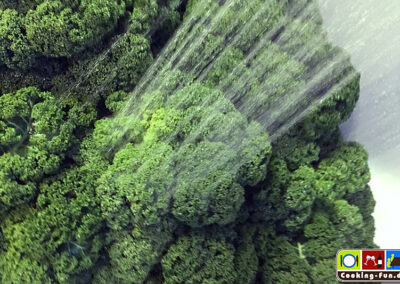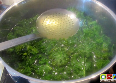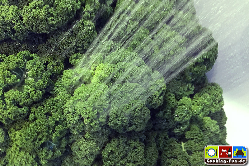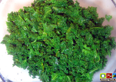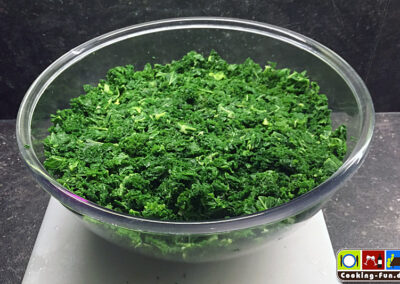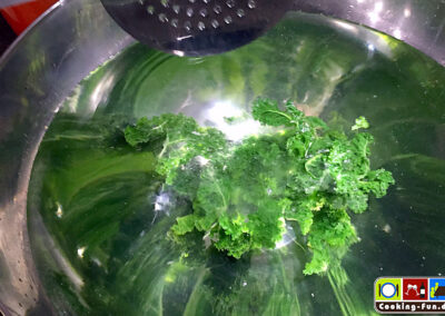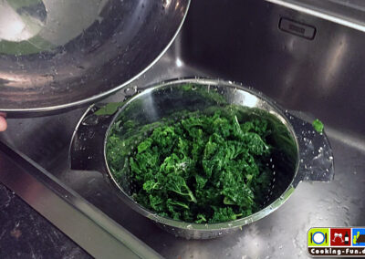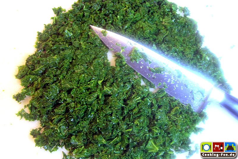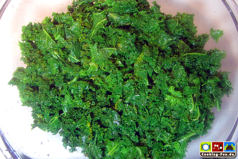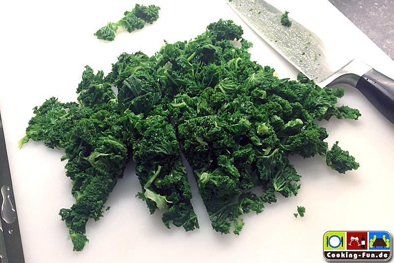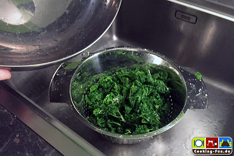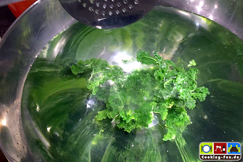 Nun die Blanchierstationen vorbereiten: Einen großen Topf mit sprudelnd kochendem Salzwasser, eine Schale mit Eiswasser (alternativ Sieb unter laufend kaltes Wasser halten), ein Sieb zum Abtropfen und eine Schale für den fertig blanchierten Grünkohl. Nun den Grünkohl portionsweise in das kochende Wasser geben und untertauchen. Nach 1-2 Minuten, wenn die Blätter im Volumen deutlich nachgegeben haben, aus dem Wasser heben und in das Eiswasser geben (oder kalt abbrausen). Nach dieser Abkühlung im Sieb abtropfen lassen, richtig fest mit beiden Händen auspressen, Grünkohl grob schneiden (kreuz und quer, damit keine ungewollt langen Kohlstreifen entstehen) und in einer Schale sammeln. Vor der nächsten Rutsche kurz kontrollieren, ob das Eiswasser noch kalt genug ist oder ob es erneuert werden muss. Erstaunlich, die zwei Kilo passen nach dieser Prozedur des Blanchierens tatsächlich in eine(!) große Schale.