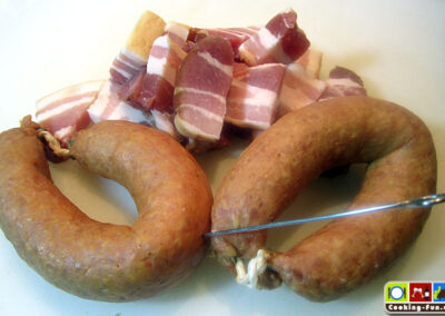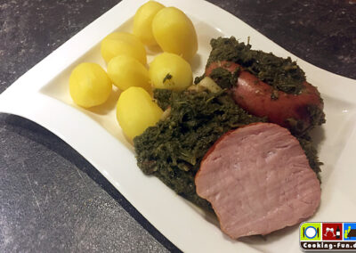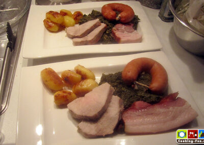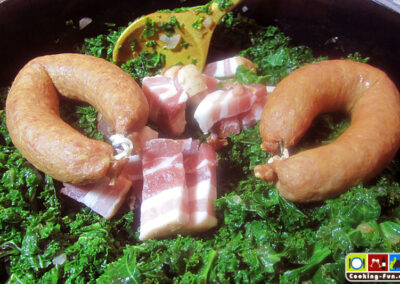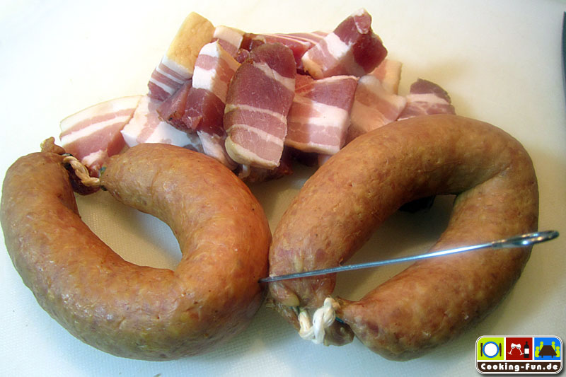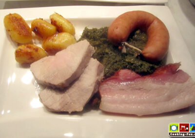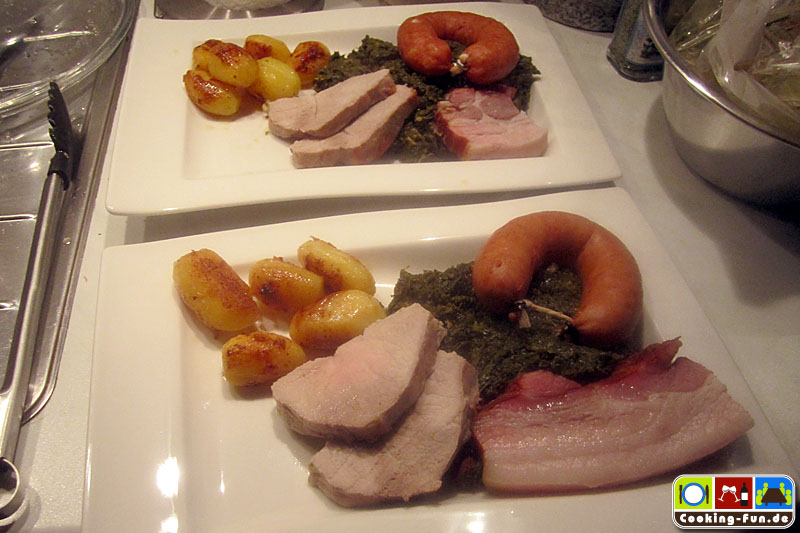 Als Fleischbeilage gibt es Bauchspeck, Bregenwürste (alternativ auch gern Mettenden) und einen Kassler-Schweinebraten (vgl. Rezept Kasslerbraten im Bratenschlauch). Für den Braten das Suppengrün kleinschneiden und in einen Bratschlauch legen, Wein angießen, Braten darauf legen und für ca. 45 Minuten bei 200°C in den vorgeheizten Ofen. Die (restlichen) Würste und der Speck werden in leicht köchelndem Wasser separat gegart (ziehen lassen, nicht kochen).