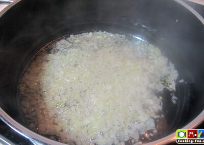 Jetzt die Zwiebel schälen und fein würfeln, eine Scheibe fingerdicken Bauchspecks (wenn es zwei Scheiben werden, ist das auch okay, ja sogar besser) in breite Streifen schneiden. In einem großen Schmortopf bei nicht voller Hitze das Gänseschmalz schmelzen und die Zwiebelwürfel darin andünsten (brauchen keine Farbe zu nehmen). Den Speck zugeben und etwas auslassen, dann den Grünkohl mit hinein und kurz mit anschmirgeln. Nach ca. 5 Minuten die Brühe angießen und je 1/2TL Pfeffer, frisch geriebenen Muskat sowie Thymian zugeben. Unter gelegentlichem Rühren ca. 1,5 bis 2 Stunden bei kleiner Hitze im geschlossenen Topf schmoren lassen.