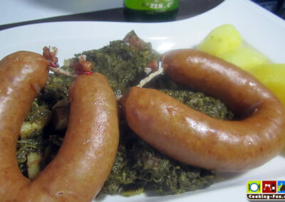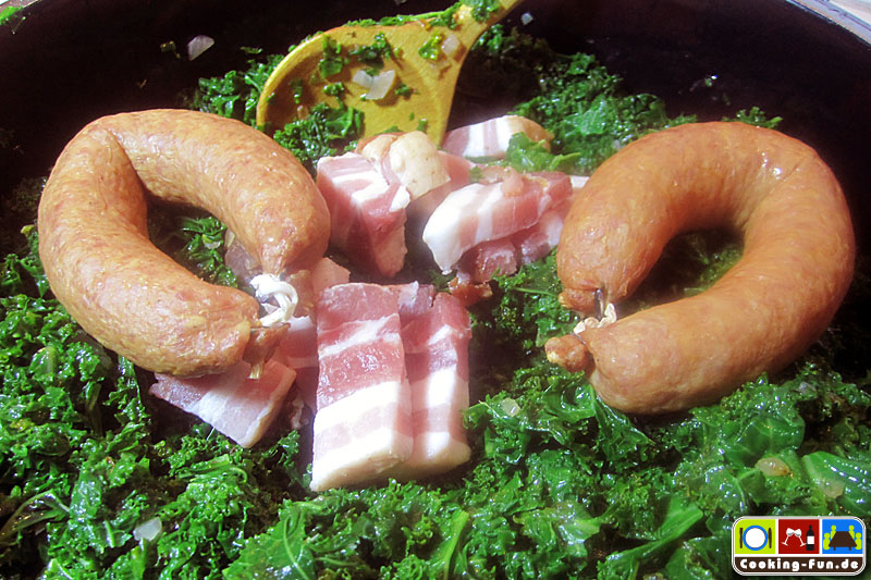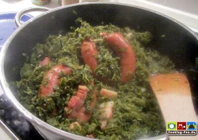 PS: Wer mag, kann Speck und Würste auch im Grünkohl garen, da ich aber immer für mindestens zwei Tage koche und der Grünkohl über Nacht gern etwas wässrig wird und am Folgetag erneut mit Haferflocken aufbereitet werden muss, lagere ich die Fleischbeilagen lieber getrennt.