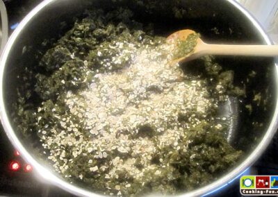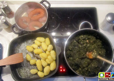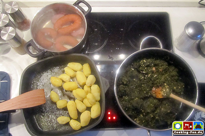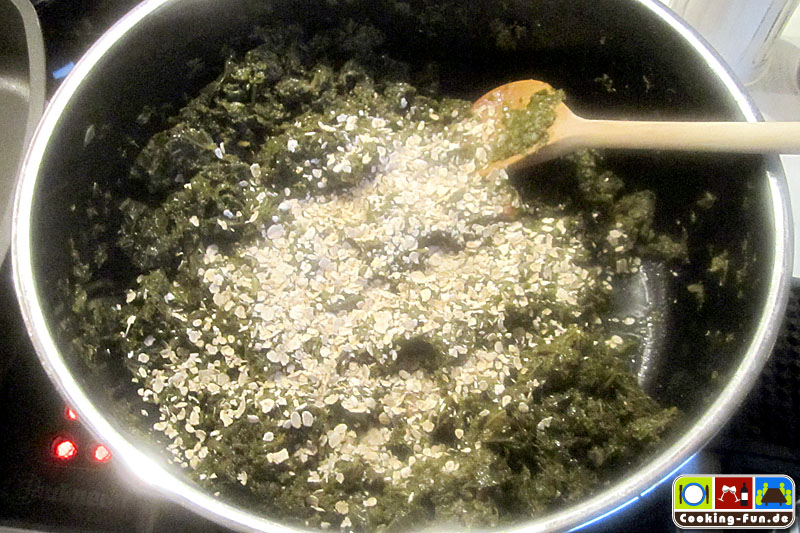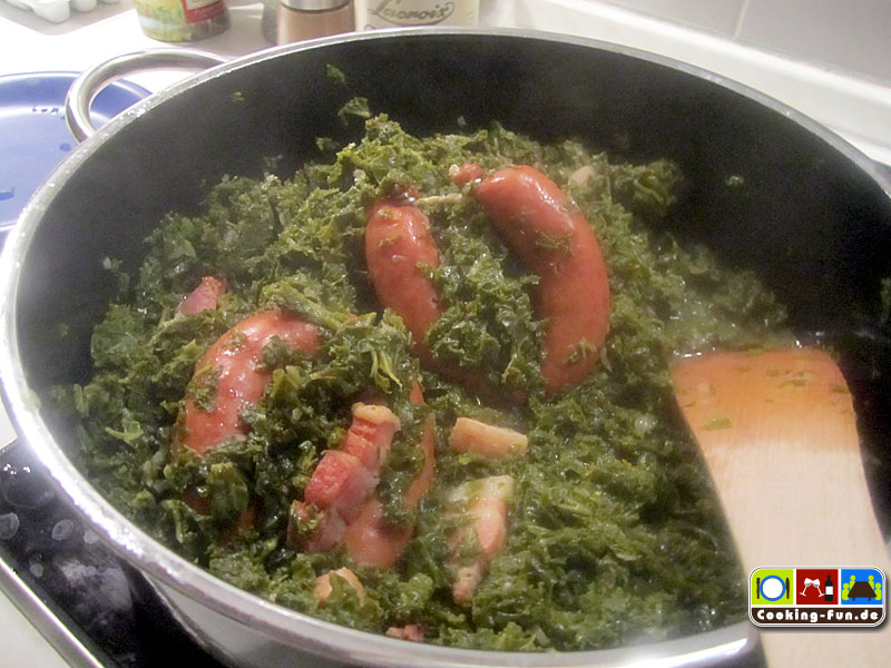 Das Grünkohlgemüse braucht man nur unter Rühren aufzuwärmen und eventuell nochmals abzuschmecken. Wenn der Kohl zu flüssig ist, einfach Haferflocken einrühren (Menge je nach Konsistenz) und 5-10 Minuten mitkochen lassen.