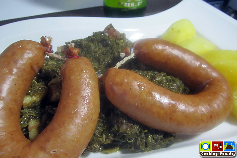 Nach der Schmorzeit nehme ich die Würste heraus (die werden nach der ganzen Arbeit gleich mal mit nem ersten Klacks Grünkohl gegessen) und schmecke erneut ab, diesmal kommen aber auch der Senf und Salz (vorsichtig verwenden, gerade wenn noch salziges Fleisch als Beilage gewählt wird) hinzu. Bei leicht geöffnetem Deckel nun auskühlen lassen und bis zum nächsten Tag kühl lagern.