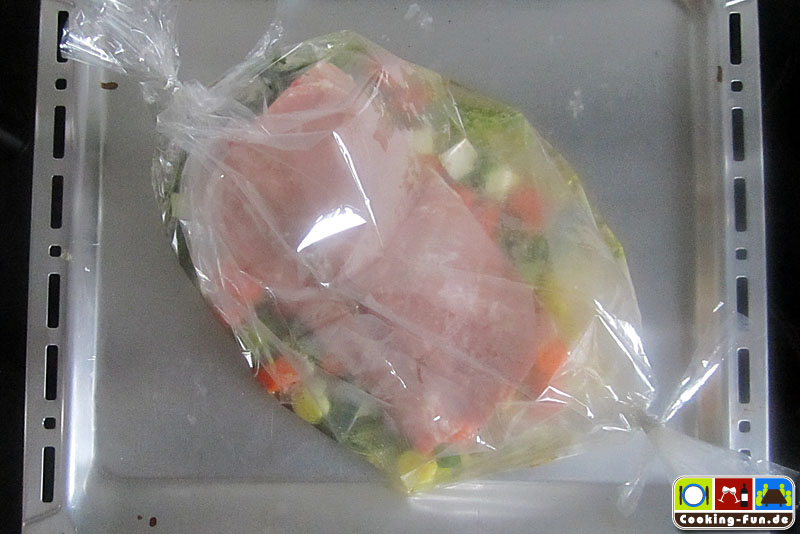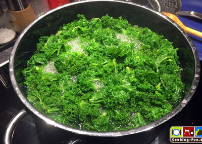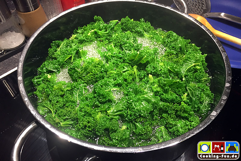 Wenn der Bratschlauch 25 Minuten im Ofen ist, kann der Grünkohl langsam aufgewärmt werden.