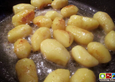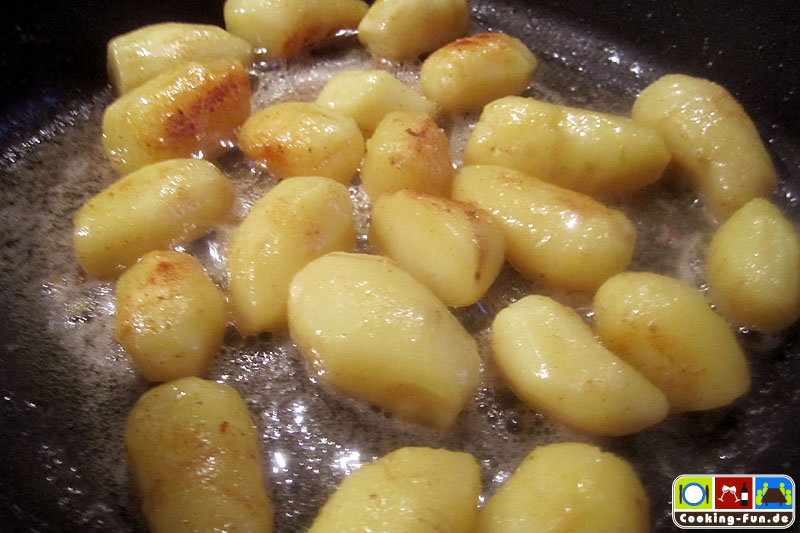 Die Kartoffeln werden ca. 10 Minuten danach in ordentlich Butter angebraten. Wenn sie anfangen die erste Farbe zu bekommen (und wieder warm geworden sind), bestreut man sie mit Zucker (Menge nach Geschmack), lässt diesen schmelzen und wendet sie im Karamell mehrfach. Sie bekommen eine tolle, süße Kruste.