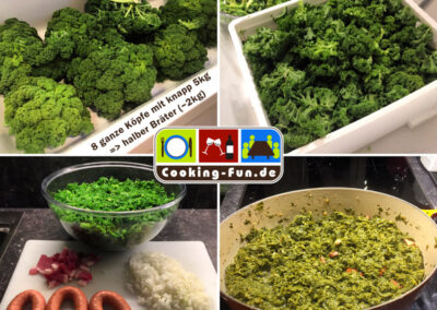 In einem weiteren Ansatz, der auch in den Bildern zu sehen ist, verwandelten sich acht (8!) ganze Oldenburger Palmen, wie die Grünkohlpflanze hier auch gern genannt wird (sie sehen wirklich ein wenig wie Palmen aus) durch Abzupfen und Blanchieren zu einem halben Topf. Es ist wirklich eine Materialschlacht. Aber gerade mit den frischen Kohlköpfen schmeckte das Ergebnis wahnsinnig gut, echt ein Erlebnis und die Arbeit wert!