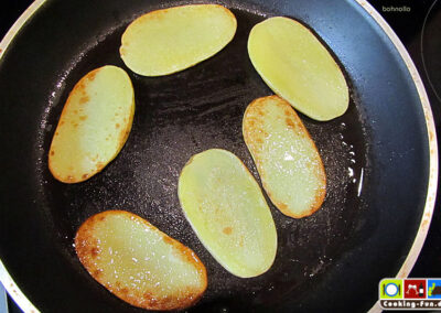 Kartoffel waschen und aus der Mitte 6 Scheiben (6-8 mm dünn) schneiden. 1 TL Öl in einer beschichteten Pfanne erhitzen. Kartoffelscheiben unter Wenden braten und mit Salz und Pfeffer würzen. Wenn die Kartoffelscheiben fertig sind, aus der Pfanne nehmen und warm halten. Pfanne auswischen. 1 TL Öl erhitzen und die Hackröllchen darin unter Wenden braten.