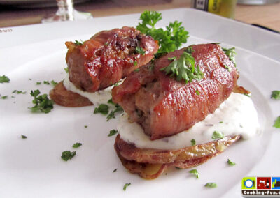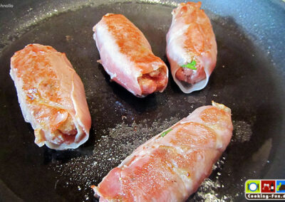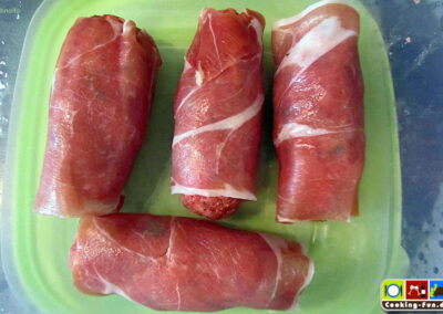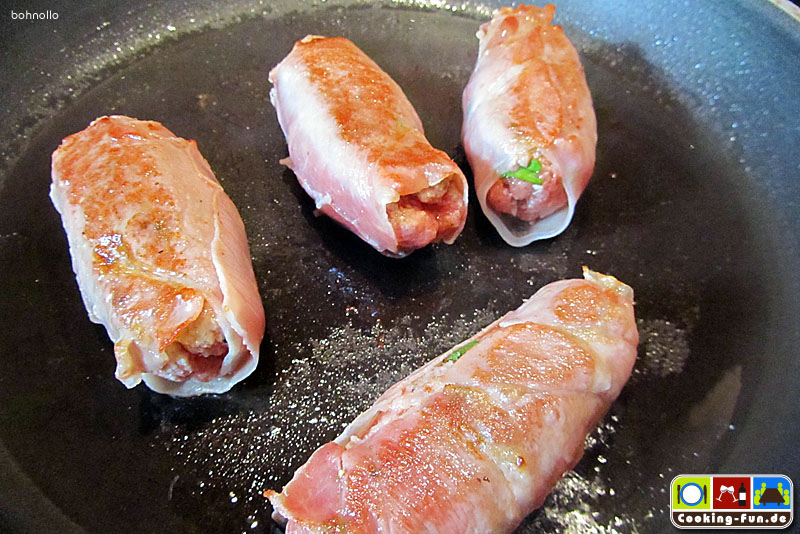 Schinkenscheibe halbieren. Aus der Hackmasse 6 kleine Röllchen formen und in jeweils 1/2 Scheibe Schinken wickeln. Röllchen kalt stellen.