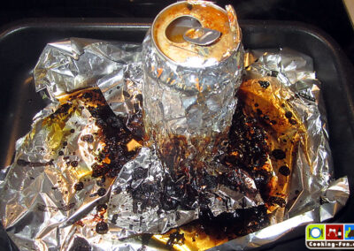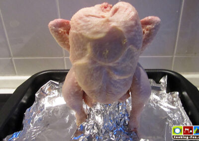 Am besten stellt man die Dose mit Huhn in eine große Auflaufform, damit die runtertropfende Marinade nicht den ganzen Herd besudelt.