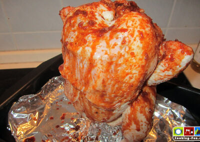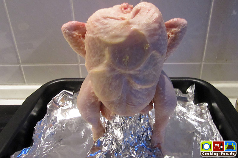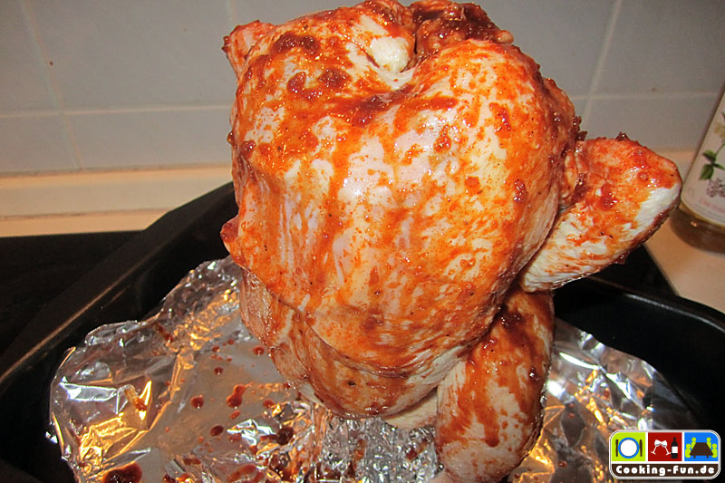 Okay, die Idee ist nun wirklich nicht neu. Ich hab mich dafür entschieden, da ich keinen Geflügelständer für den Ofen kaufen wollte. Das Ergebnis ist ein super saftiges Hähnchen.