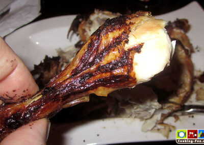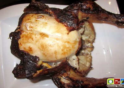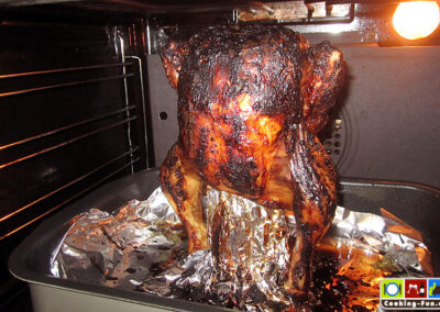 Die Bierdose säubern, öffnen, einen guten Schluck abtrinken und ggf. mit Alufolie umwickeln (Öffnung freimachen). Dann das Hähnchen auf/über die Dose setzen, mit den Fingern zwischen Haut und Brust gleiten und in die entstandene ‚Lasche‘ die Zitronenscheiben schieben sowie etwas Marinade hineingeben. Nun das Hähnchen außen mit der Marinade gründlich bepinseln und bei 180°C mit Umluft auf unterster Schiene in den Ofen. Faustregel zur Dauer: Je Kilogramm ca. 60 Minuten, also gute 90 Minuten für unser Hähnchen.