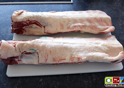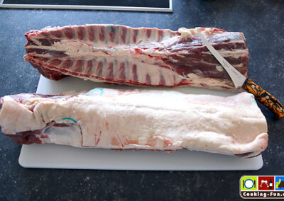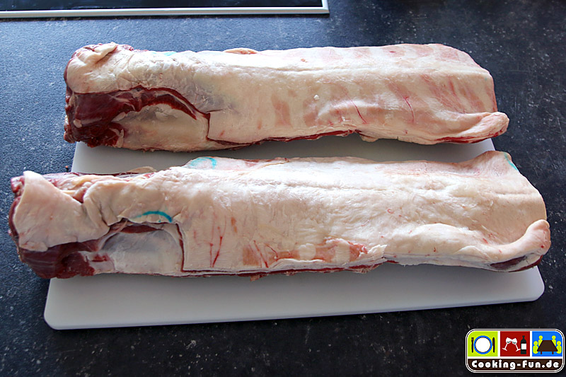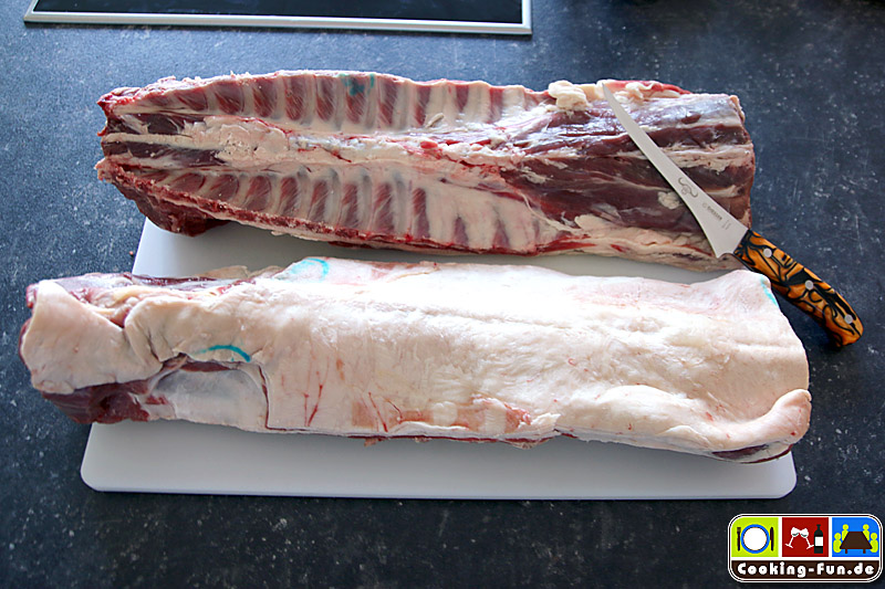 Da ich etwas mehr Gäste, aber keinen Platz im Ofen für mehrere Keulen hatte, entschloss ich mich zu einem Ragout. Zumeist wird es aus Brust-, Nacken- und/oder Schulterfleisch gemacht. Liebenswürdiger Weise bekam ich vom Schlachter meines Vertrauens (Dank an Fischers Heideschlachtetei) zwei ganze Rücken. Wahnsinn, fast zu schade für Ragout, aber der Plan stand und der Einkauf war getätigt. Mit den ganzen Rücken wächst auch der Respekt vor der Fleischqualität. Das Auslösen war Herausforderung und Vergnügen zugleich. Nur gut, dass ich kürzlich ein Ausbeinmesser bekommen habe. Es blieben am Ende 2,5kg Fleisch übrig.