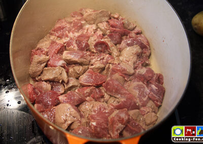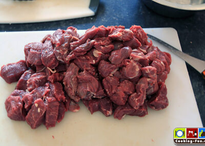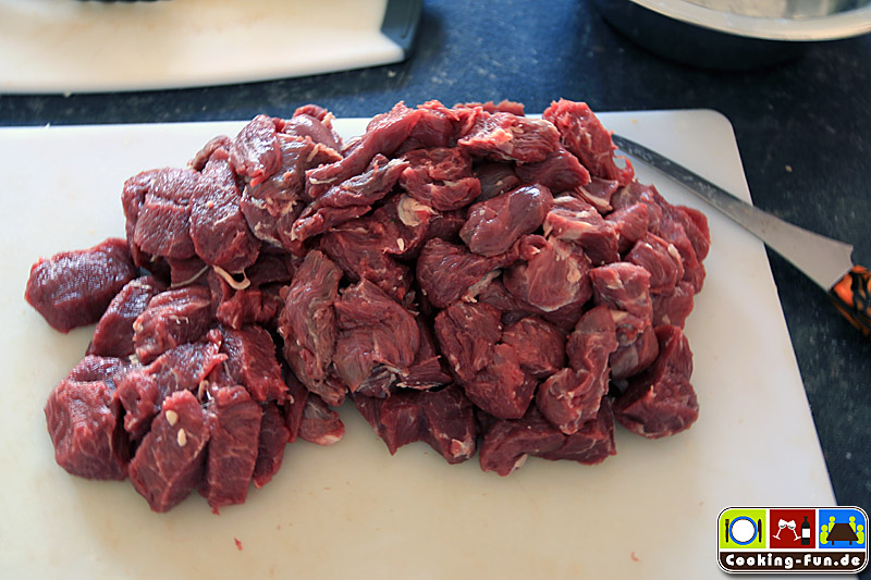 Das Fleisch putzen, ggf. Sehnen entfernen, in mundgerechte aber nicht zu kleine Würfel schneiden.