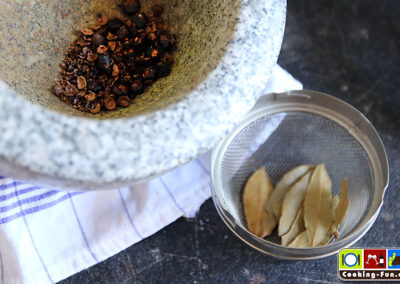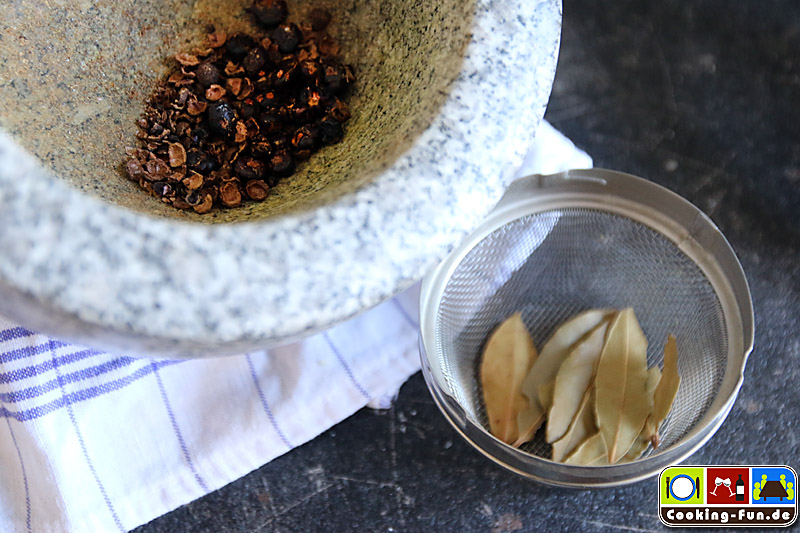 Beeren und Körner für den Gewürzsack leicht andrücken und in einen Teebeutel geben. Lorbeerblatt dazu und verschließen. Alternativ klappt das auch gut mit einem Tee-Ei.