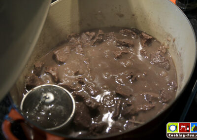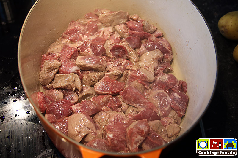 In einem großen Bräter das Schmalz erhitzen und darin die Fleischwürfel von allen Seiten scharf anbraten (ggf. portionsweise). Temperatur etwas reduzieren, die Zwiebelwürfel zugeben und mit anschwitzen (sie dürfen etwas Farbe nehmen, sollen aber nicht schwarz werden).