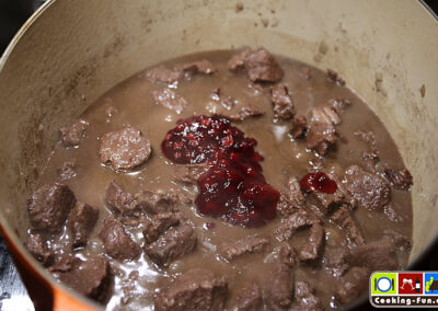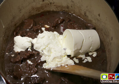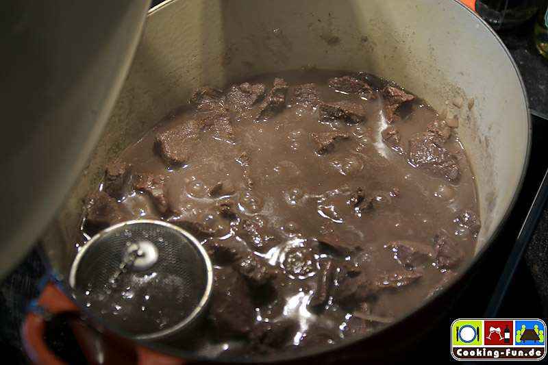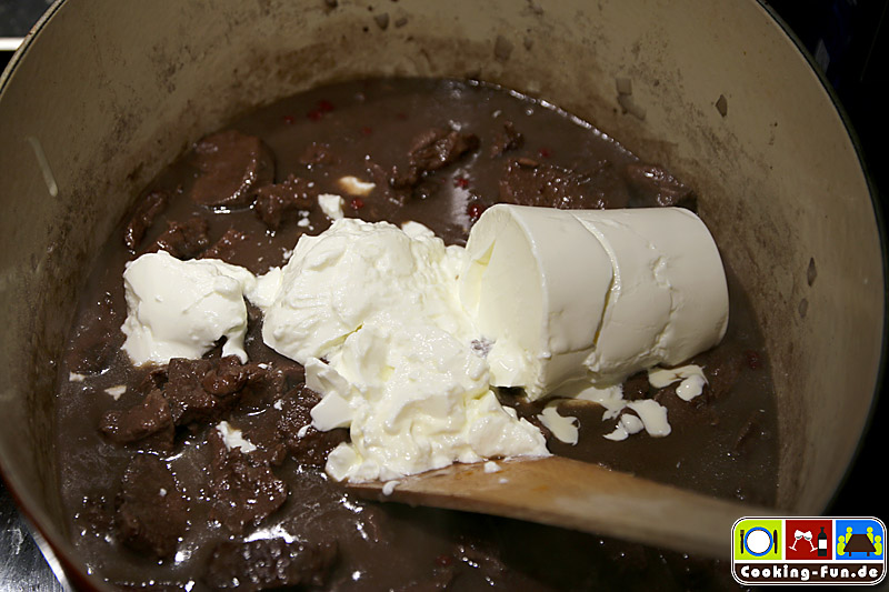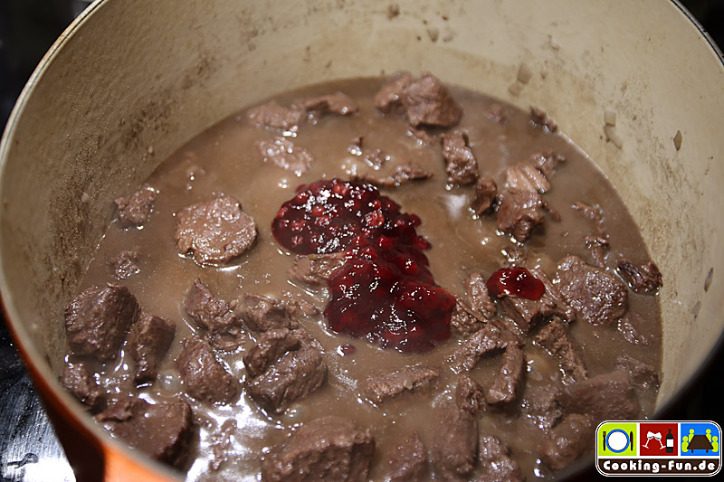 Wenn das Fleisch zart ist, den Gewürzsack entfernen, etwas Flüssigkeit abschöpfen und mit der Sauren Sahne verrühren. Sodann wieder zugießen und die Soße mit Salz, Pfeffer sowie Preiselbeeren abschmecken.