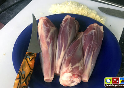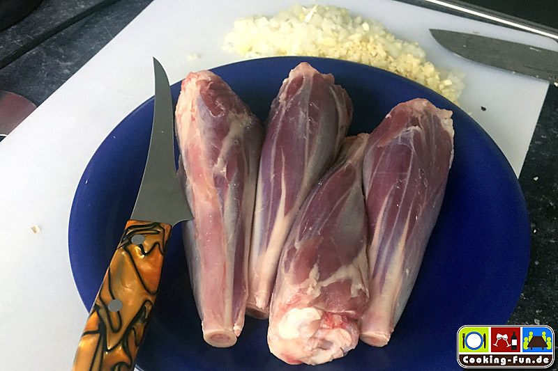 Die Stelzen putzen, Silberhäute (ohne das Fleisch zu verletzen) weitestgehend entfernen.