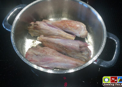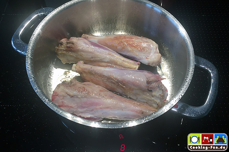 Einen Topf nehmen, in den die Stelzen nebeneinander Platz haben aber der auch nicht viel größer ist (sonst Flüssigkeitsmenge ggf. erhöhen). Etwas Öl hineingeben und die Stelzen scharf von allen Seiten darin anbraten, so dass sie etwas Farbe bekommen.
