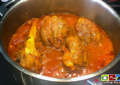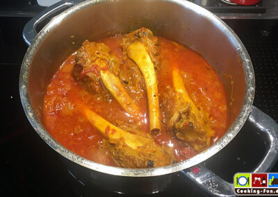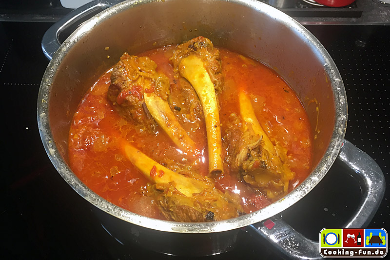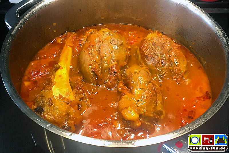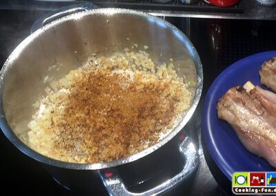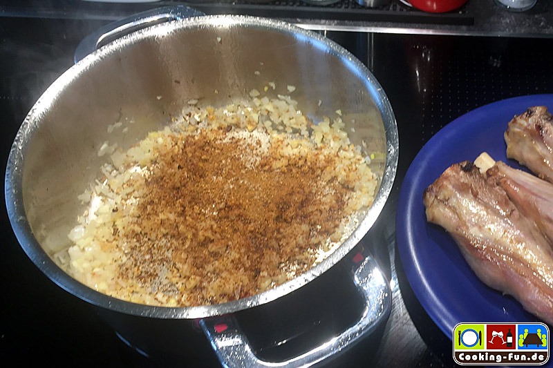Stelzen aus dem Topf nehmen, Temperatur runterregeln (jetzt soll nichts mehr anbrennen), Zwiebel- sowie Knoblauchwürfel zugeben und glasig anschwitzen. Baharat drüberstreuen und etwa 20 Sekunden mit anschmirgeln, spätestens jetzt duftet es in der Küche.