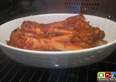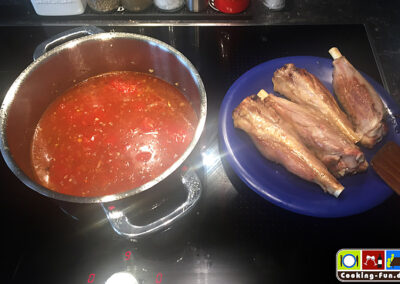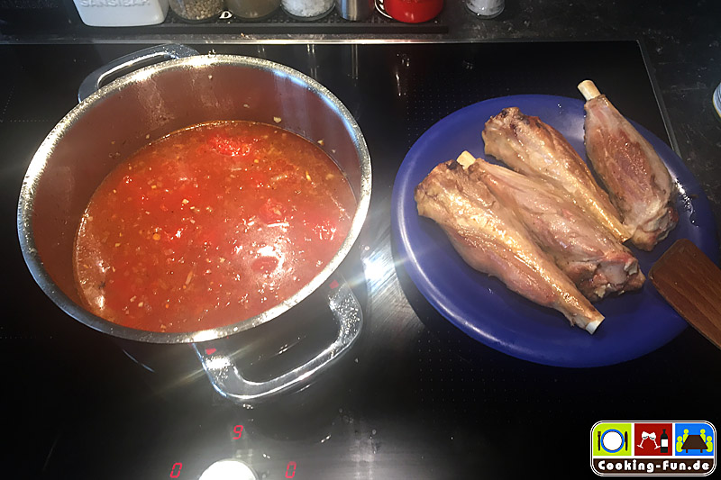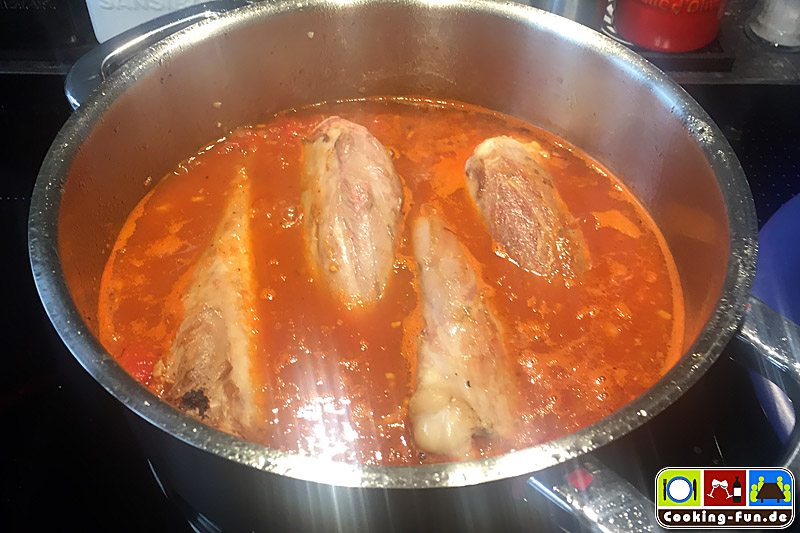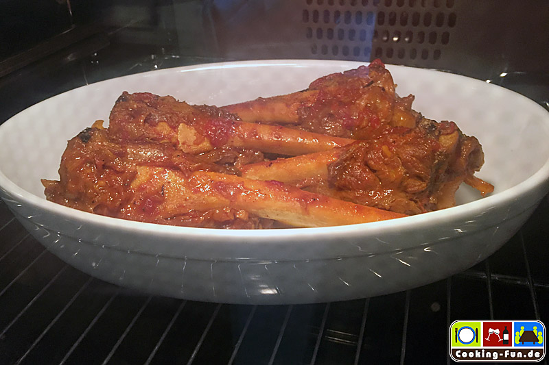 Nun sollte sich das Fleisch schon fast von allein vom Knochen lösen. Hebt die Stelzen vorsichtig auf einen Teller und stellt sie im Ofen bei 100°C warm. Den Sud nun kräftig aufkochen lassen, so dass er reduziert und eindickt. Je nach gewünschter Dicke der Soße den Topf dann vom Herd nehmen und mit den Stelzen anrichten.