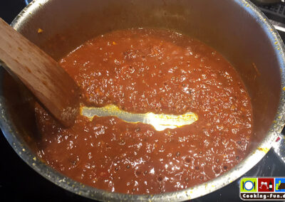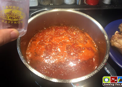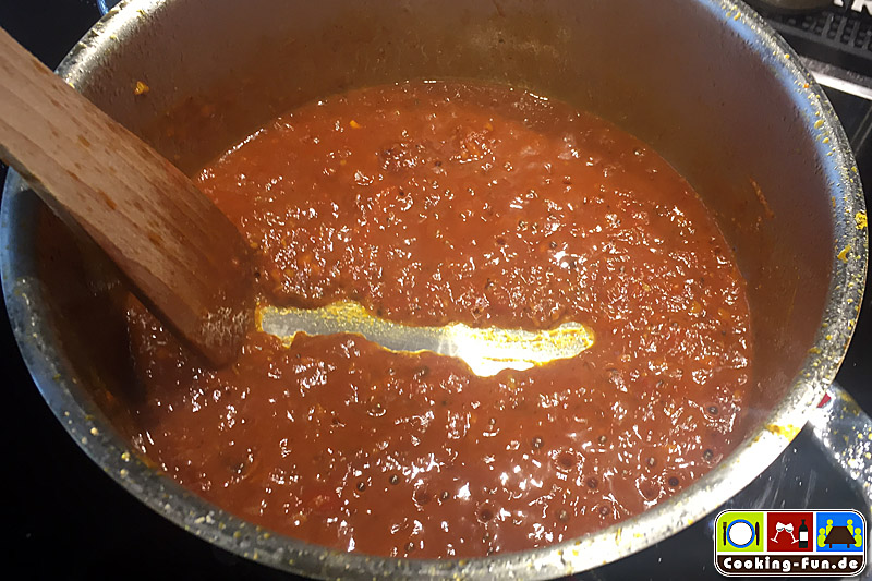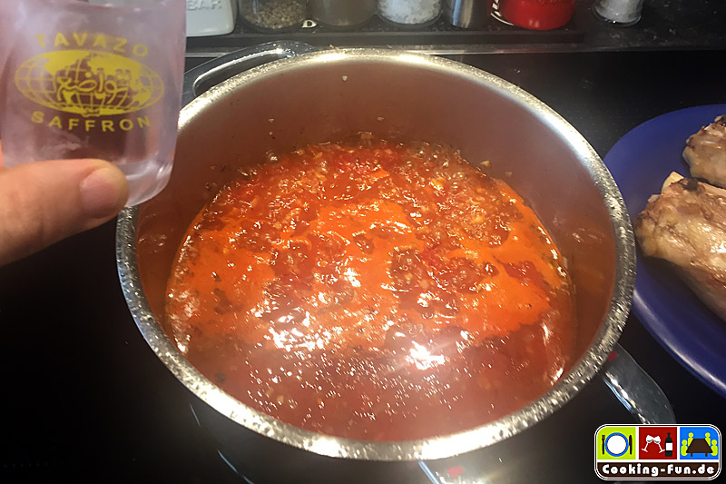 Mit dem Kalbsfond ablöschen, dabei eventuellen Bodensatz lösen. Tomaten in der Dose etwas zerteilen und zugeben. Auch den Safran zugeben.