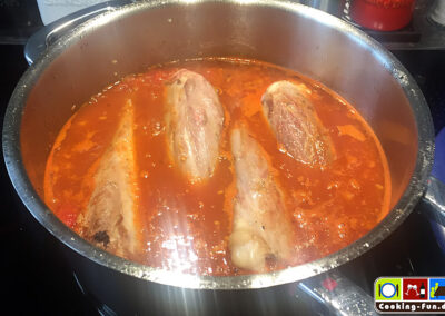 Nun die Stelzen in den Sud legen, alles einmal kurz aufkochen lassen und dann bei kleiner Hitze knappe zwei Stunden bedeckt köcheln lassen, die Stelzen dabei ab und an wenden.
