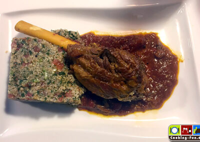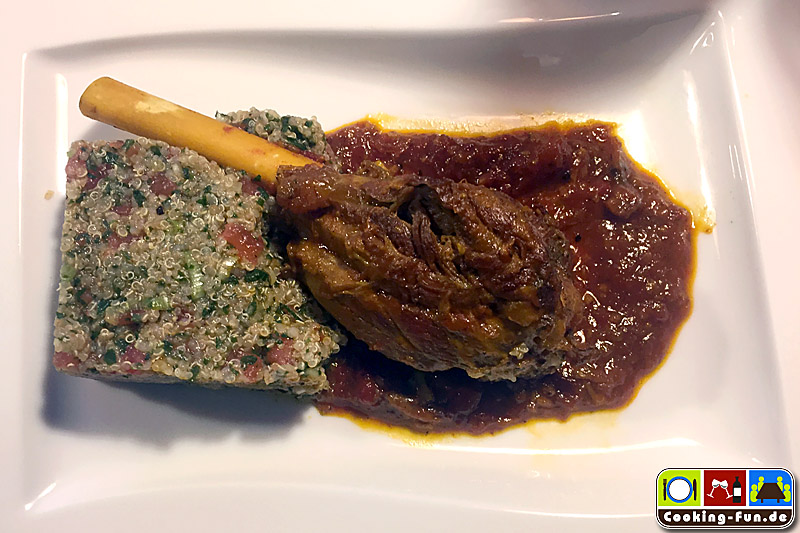 Als Beilage mit Fokus Niedersachsen bieten sich Kartoffeln an, zielt der Fokus auf die Herkunft des Safran, so bietet sich Reis an (es gibt da ein leckeres iranisches Rezept „Baghali Polo va Mahiche“ = Bohnenreis mit Lammhaxe – muss ich auch bald mal kochen). Aber auch die gewählte Beilage des noch warmen Quinoa-Taboulé war toll. Ein Feuerwerk der Aromen an unseren Gaumen.