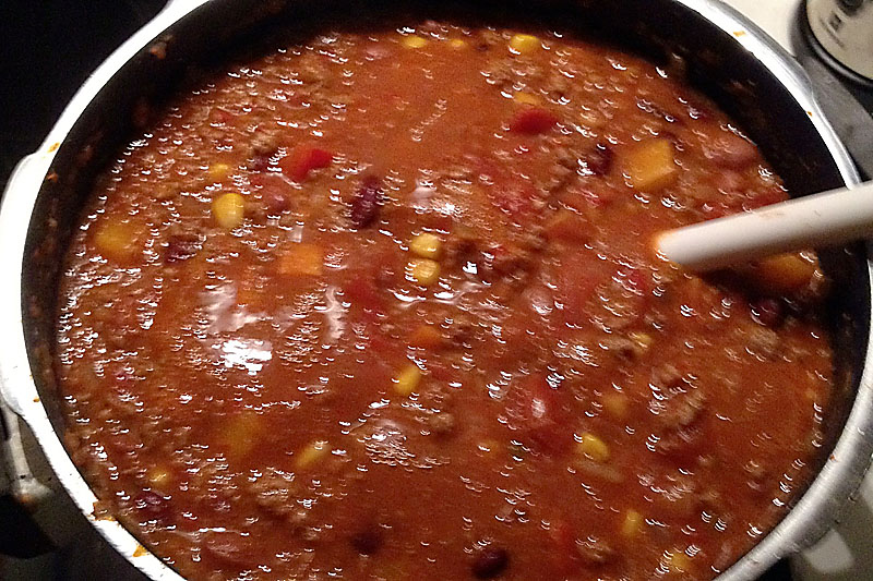 Lasst das Ganze jetzt mindestens zwei Stunden auf kleiner Flamme durchköcheln und durchziehen und würzt nach Belieben nach. Am besten schmeckt das Chili, wenn es über Nacht abkühlt und am nächsten Tag aufgewärmt und serviert wird.