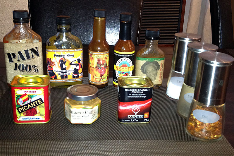 Bleibt noch das Thema Schärfe, da müsst Ihr selbst entscheiden. Manch einem reicht ja schon eine Priese Pfeffer, die Härteren greifen zu Cayennepfeffer, ich liebe die echte Chilischotenschärfe und da gibt es viele Sorten mit verschiedenen Schärfegraden zur Auswahl. Die von mir bevorzugte Habanero ist echt scharf und zwei, drei Stück davon sorgen in einem großen Topf schon für Schweißperlen auf der Stirn, leider verkocht ihre fruchtige Note, so dass meist noch ein paar andere Sorten ihren Weg in mein Chili finden. Nach dem Schneiden von Chilischoten übrigens gründlich die Hände abspülen. Alternativ gibt es auch scharfe Soßen oder Chilipüree aus Flaschen etc.