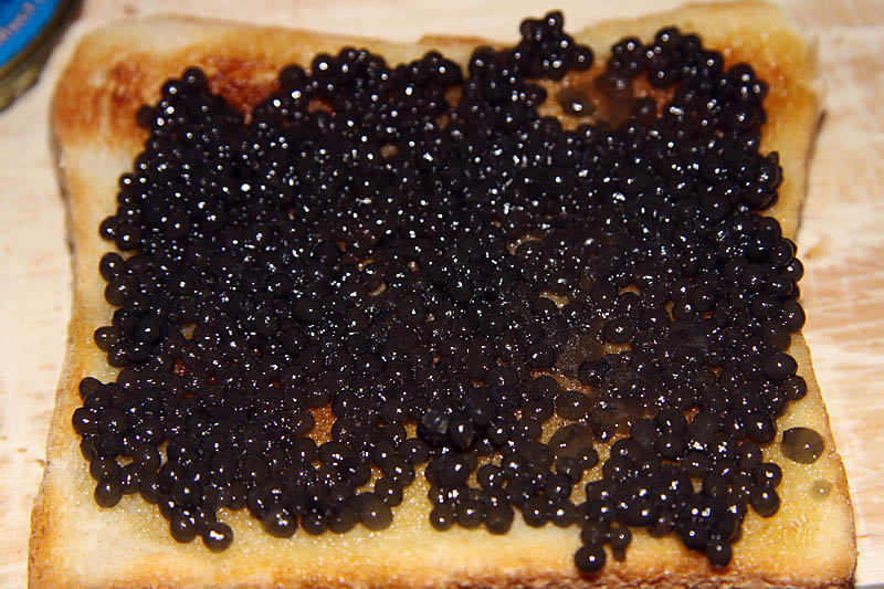 Toast goldbraun toasten und leicht buttern, Kaviar mit einem Perlmuttlöffel darauf verteilen und mit frischem Zitronensaft beträufeln.