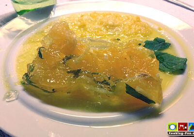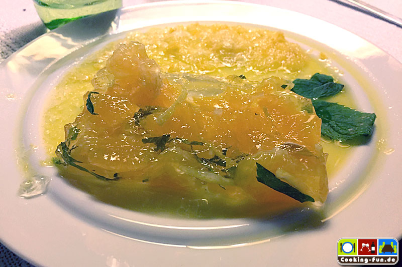 Der Nachtisch kam dann von Annette und Michael, ein fruchtig schönes Geleekonstrukt mit sauber gestapelten Orangenfilets. Die Soße wurde mit Zesten von der Orange verfeinert, die dem ganzen eine schöne Textur sowie angenehm bittere Spitzen verliehen hat. Tolles Finale.