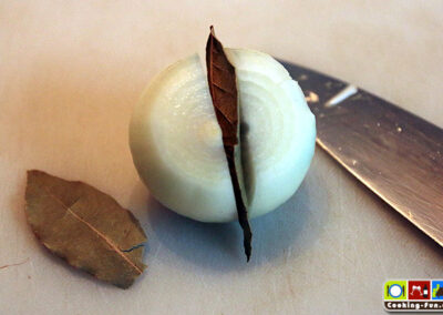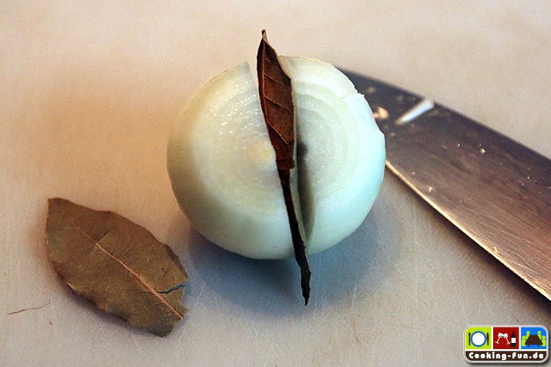 Während der Einweichzeit die Zwiebeln wirklich sehr fein würfeln und eine kleine Zwiebel mit einem Lorbeerblatt spicken. Für die Beilage die gekochte Rote Bete aufschneiden und die Kartoffeln schälen.