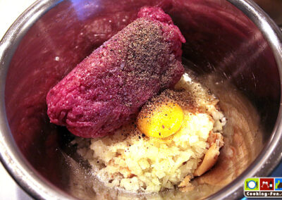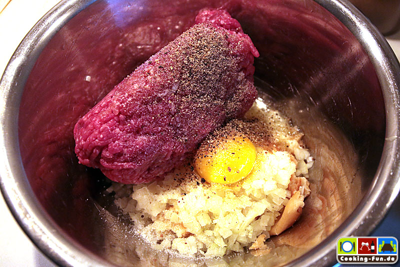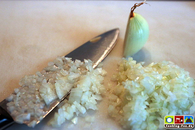 Tipp: Wer nicht auf „rohe“ Zwiebeln beißen mag (so wie ich), der kann die Zwiebelwürfel vorher farblos in wenig Öl anschwitzen, bis sie glasig werden und dann weiter verarbeiten. Der Mehraufwand lohnt sich.