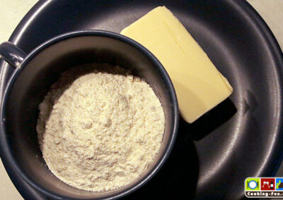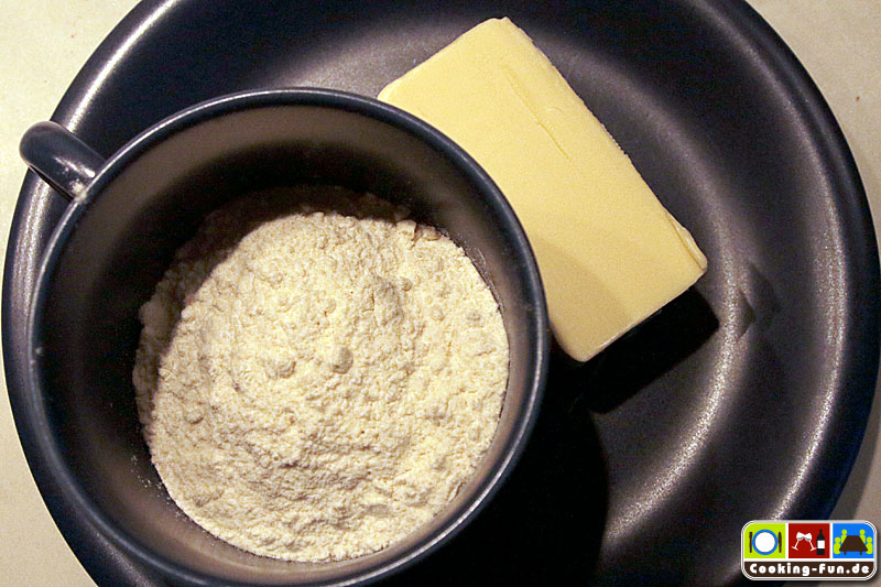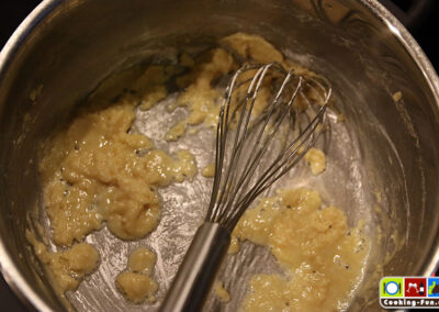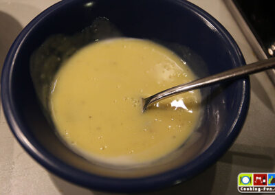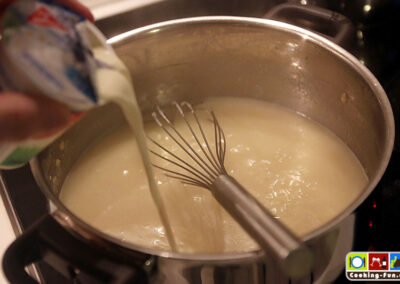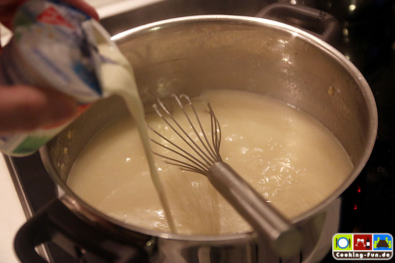 Legieren ist das Einrühren von verquirltem Eigelb. Das dient der geschmacklichen Verfeinerung und edlen Bindung. Da wir die Soße bereits mit einer Mehlschwitze gebunden haben, dient es hier mehr dem Geschmack und der Soßenfarbe.