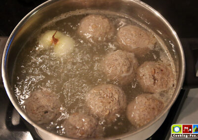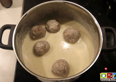 In einem breiten Topf (Klopse sollten darin nebeneinander Platz haben) 2 Liter Salzwasser zum Kochen bringen, die Lorbeerblatt-Zwiebel mit hineingeben. Klopse ins Wasser geben, die Temperatur geht jetzt natürlich runter. Wenn das Wasser wieder aufkocht, die Flamme drosseln, das Wasser soll für die ganze Zeit von 15-20 Minuten nur leicht köcheln.