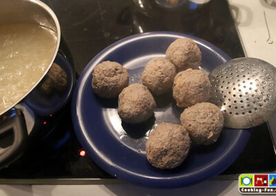 Mit einer Schaumkelle die garen Klopse vorsichtig aus dem Wasser heben und abtropfen lassen.