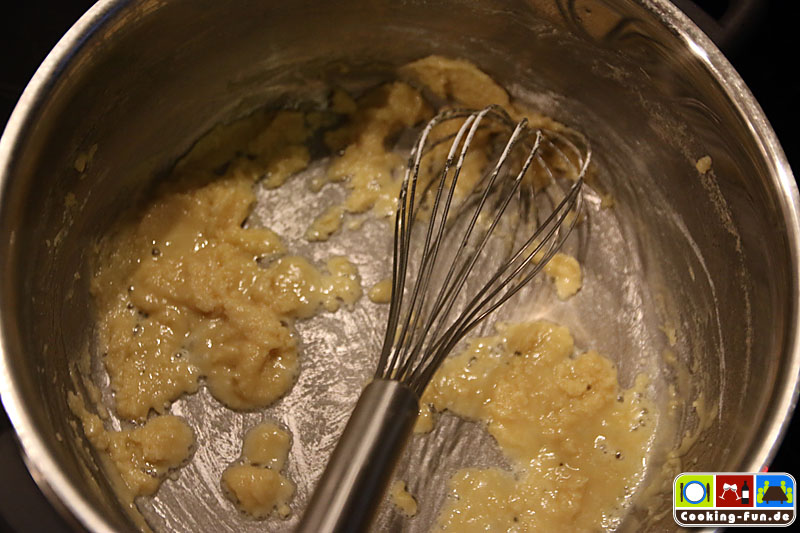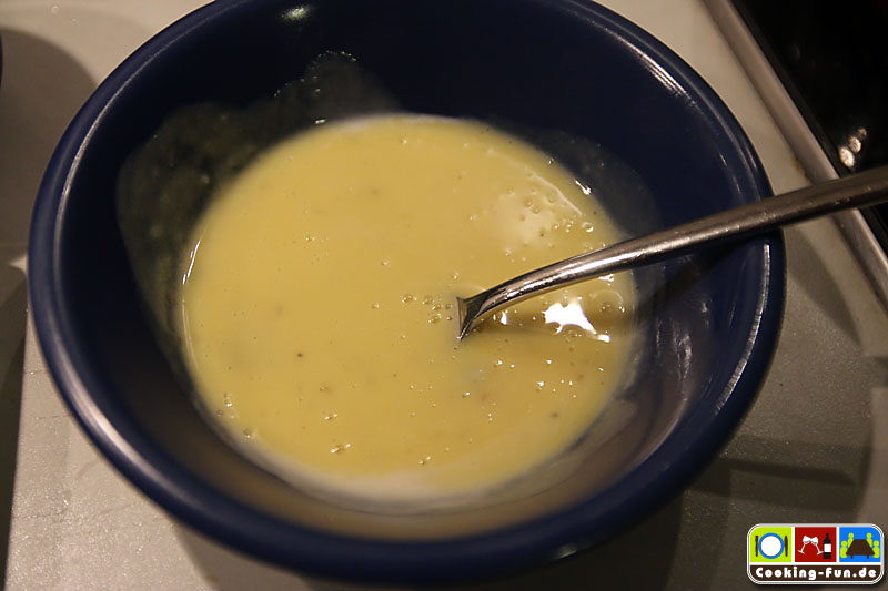 Wenn Ihr etwas Vorrat zubereitet habt, füllt jetzt die nicht verwendete Menge ab. Denn ohne das Eigelb vom nächsten Schritt lässt sich das Ganze am nächsten Tag leichter wieder erwärmen und es kann dann frisch legiert werden.