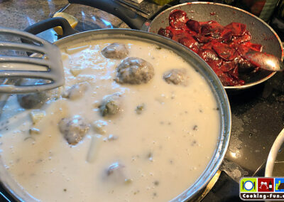 Den Klops-Kochtopf kurz ausspülen, grob trocknen und darin aus Butter und Mehl eine Mehlschwitze ansetzen und die Brühe sowie danach die Sahne einrühren. Wenn es etwas fettärmer sein soll, lasst die Sahne weg und nehmt etwas mehr Brühe. Einmal aufkochen und bei kleiner Hitze noch ca. 5 Minuten köcheln lassen. In dieser Phase darf abgeschmeckt werden. Dazu die Kapern mit 2-3TL ihrer Flüssigkeit einrühren. Für ein noch intensiveres Kapernaroma einfach ein paar Kapern pürieren und mit zugeben. Mit Zitronensaft, Salz, Pfeffer und Zucker abschmecken. Solltet Ihr Spargel mitgekocht haben, kommen jetzt auch der in die Soße.