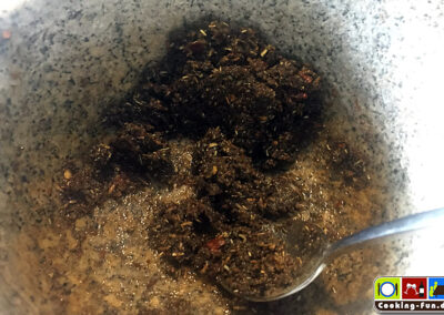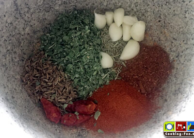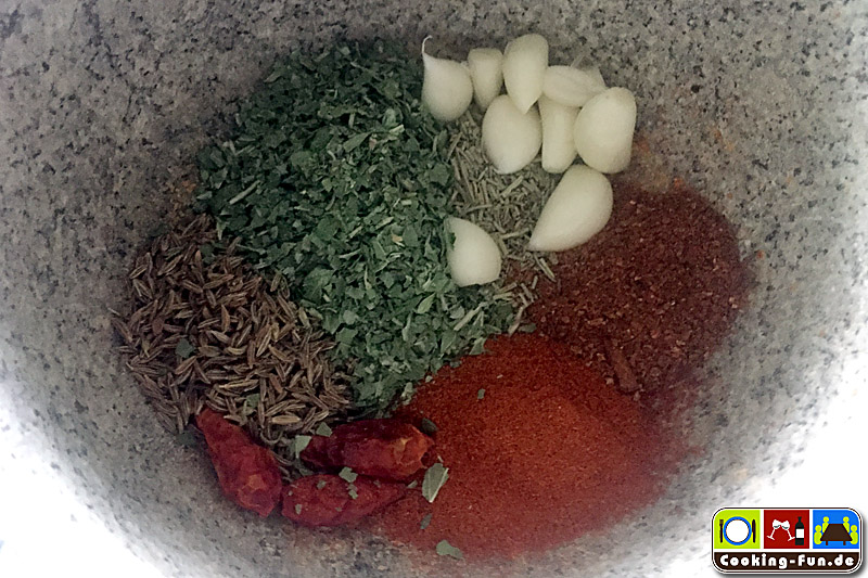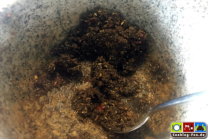 Chilis im Mörser zerstoßen, Knoblauch hinzu und alles zu einer Paste zermahlen. Die übrigen Gewürze mit hinein. Schließlich noch etwas Olivenöl dazu, damit man eine schöne Paste erhält, die am Fleisch anhaftet. Also nicht zu flüssig ansetzen.