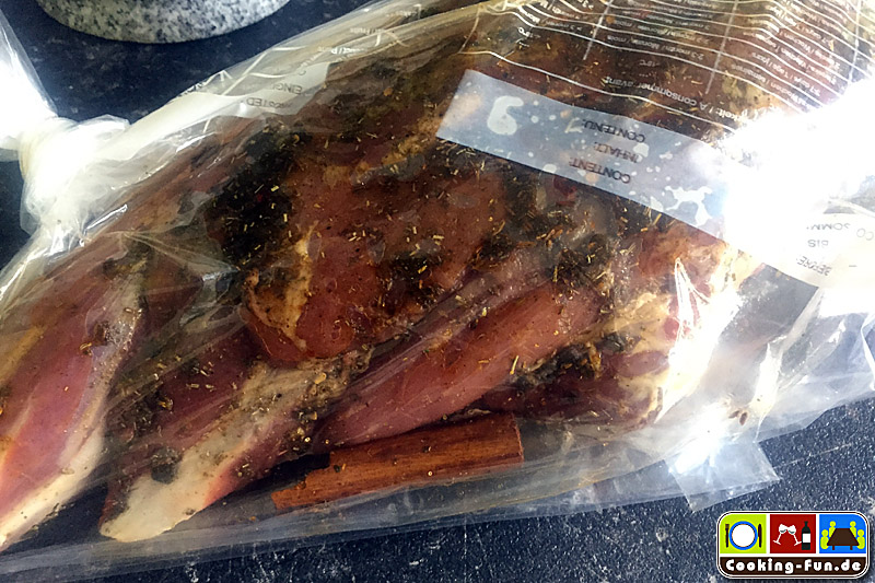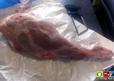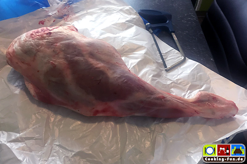 Die Keule von Haut, Fett, Silberhäuten und Sehnen weitestgehend befreien. Ich musste den Knochen unten kürzen, damit das gute Stück in den Bräter passt. Die Marinade in die Keule einmassieren. Sorry, aber hier müssen die Hände ran. Dann über Nacht im Kühlschrank ziehen lassen. Ich habe die Keule dazu in einen 10L Gefrierbeutel gewickelt.