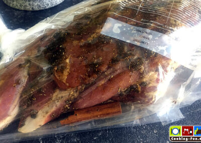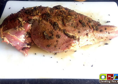 Es ist empfehlenswert, die Lammkeule einen Tag vorher mit der Marinade einzureiben und über Nacht die Aromen wirken zu lassen. Daher beginnt die Arbeit am Vortag.